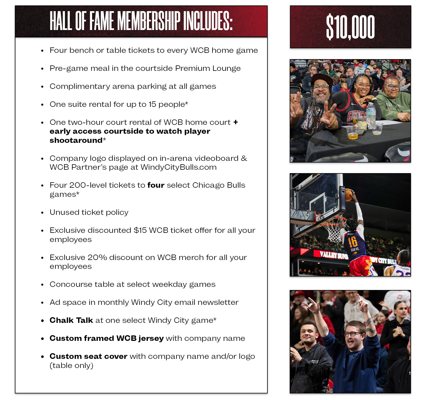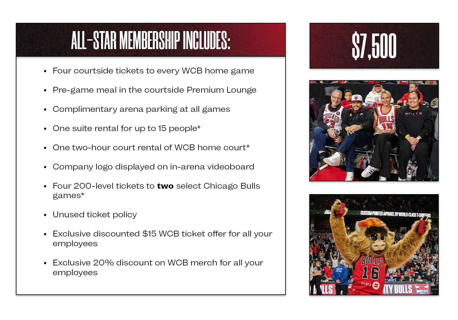 A Windy City Bulls Business Membership offers the opportunity to bring your company into the Bulls family. The Windy City Bulls are the NBA G League affiliate of the Chicago Bulls and our Business Memberships are designed to offer benefits at both the G League and NBA levels.